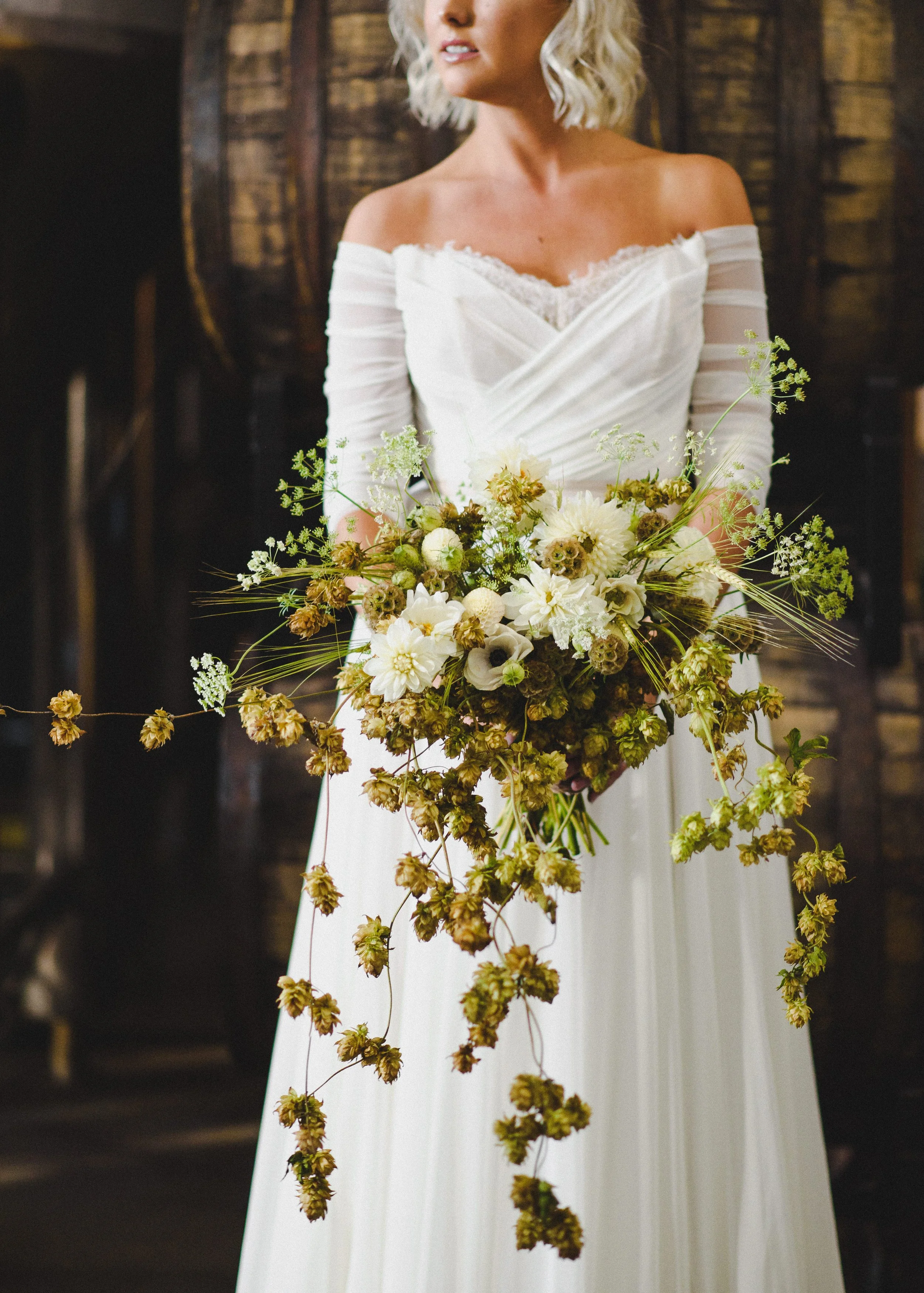 One of my farmers told me she had hops that were going to be completely gone in few weeks, so we put together this beer-themed shoot in a brewery. I used only local flowers to underline the hops vines and lead with texture, drapiness, and after that, I just let all the magic flow.
