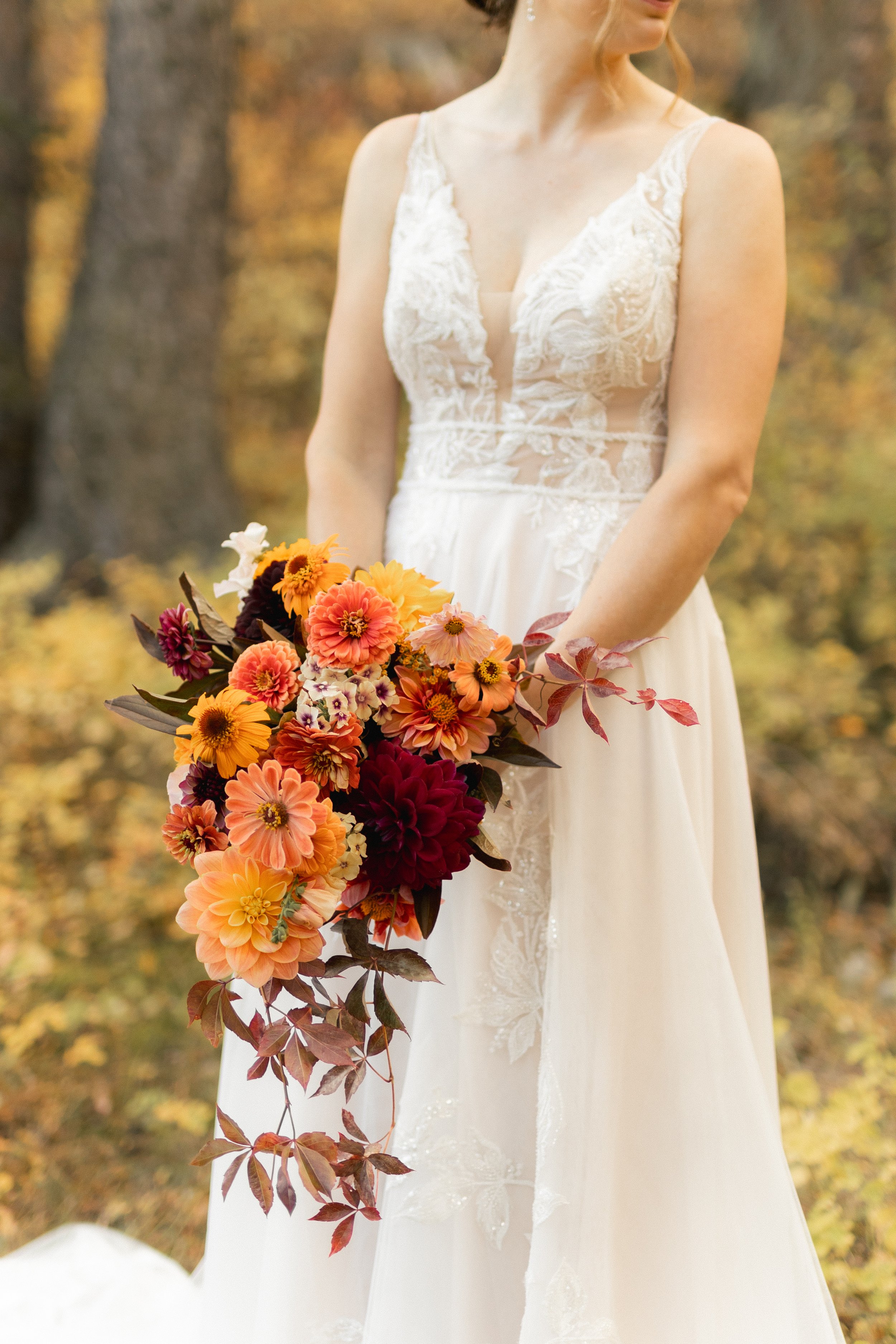 Maddie is my cousin’s cousin…work that one out. Technically we’re not related, but who’s checking? We claim we’re more-or-less cousins. She lived in our studio apartment for a while and just came out to Montana for a change of pace, air, job. But lo and behold! She met a strong, fun and kind man and got married ASAP. We delighted in celebrating them, their love and the beauty that was their day. It was a quintessential fall day, hot in the sun, cool int he shade—I was sweating while I installed, but immediately recovered in the shade. To honor Maddie’s dad who passed several years ago, we raised a glass of Talisker during the reception. Our palette was saturated autumn colors with a dash of blushy peach. At the altar, we created a meadow-garden with moss as an accent for a nod to the Pacific Northwest, where Maddie was born and raised. Maddie trusted me entirely to create whatever struck my fancy, so I designed wild, cascading and soaring arrangements.